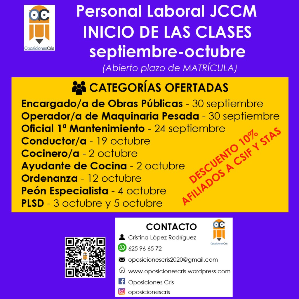 Desde Oposiciones Cris vamos a preparar las siguientes categorías para las plazas ofertadas en las ofertas de empleo público de 2023 y 2024 (convocatoria prevista a finales de 2024 y exámenes a finales de 2025) de la Junta de Comunidades de Castilla-La Mancha (para más información pinchar en la categoría correspondiente).