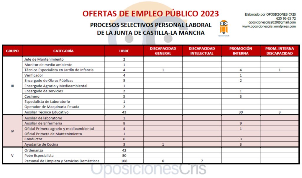 Al final de la entrada se puede ver la Oferta de Empleo Público de la Junta de Comunidades de Castilla-La Mancha correspondiente al año 2023 (está pendiente la publicación de la oferta 2024).